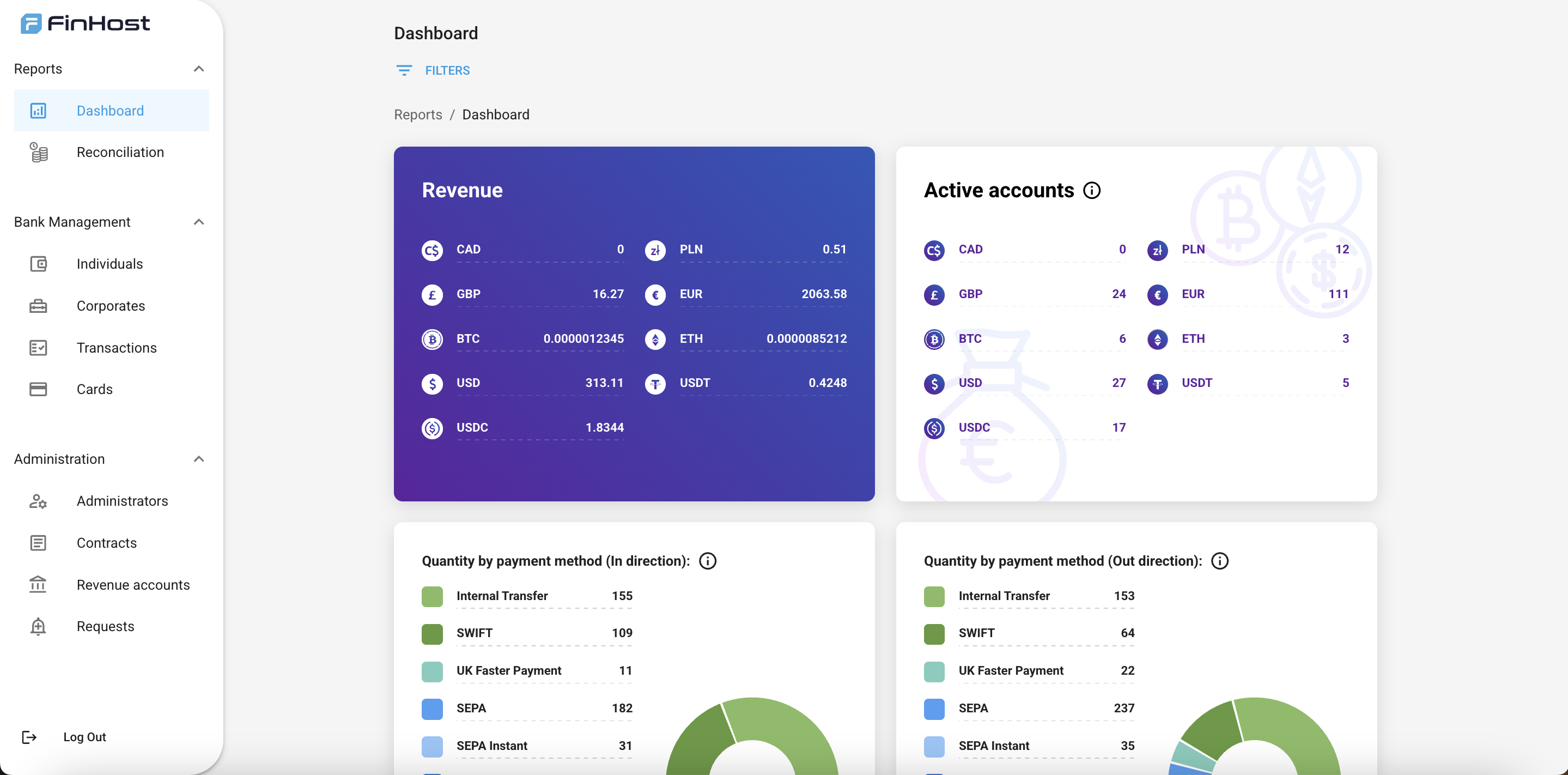 - Administration → Administrators, Contracts, Revenue accounts, Requests
